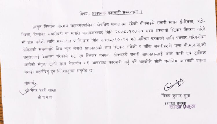 विगत लामो समयदेखि ई–रिक्सालाई मापदण्डभित्र ल्याउने महानगरपालिकाले प्रयास गरेपनि त्यो कार्यान्वयन हुन सकेको छैन । महानगरपालिकाले वीरगन्जमा सञ्चालित ई–रिक्साहरुलाई मापदण्डभित्र ल्याउनका लागि १० वटा रुट निर्धारण गरिएको छ, तर कसैले पनि रुटको पालना गरेको पाइएको छैन।  महानगरपालिका का कर्मचारी तथा  नगर प्रहरी  दिन भरी कर्यालय को गेटमा बसि समय बिताउन कपिश भएका छन।  महानगरपालिकाको कानुन कागज मा मात्र सिमित राखेका  छन नगर कर्मचारी हरु। रुट पर्मित को लगि  मिती २०७८-११-१० को समय दिदा पनि इह ई–रिक्सा, अटो टेम्पू हरुका चालक तथा साहु नगर रुट पर्मिट लिइरहेका छ्रैनन् ।