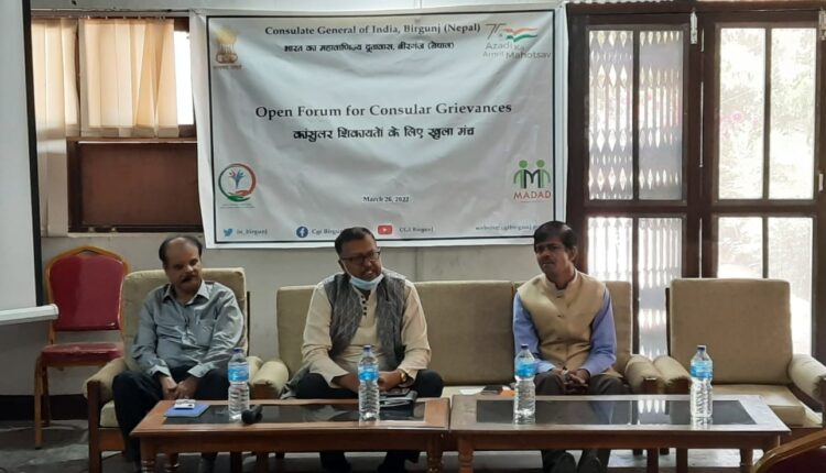 भारतको महावाणिज्य दूतावास द्वारा आजादी का अमृत महोत्सव अन्तर्गत, बीरगन्ज स्थित भारतको महावाणिज्य दूतावास द्वारा 26 मार्च 2022 मा वाणिज्य दूतावास परिसरमा चौथो “Open House for Consular Grievances” आयोजना गरियो। कार्यक्रमको उद्देश्य नेपालमा बसोबास गर्ने पीडित भारतीय नागरिकहरूको गुनासो गैर-नियमित कन्सुलर गुनासोहरू समाधान गर्नु थियो।