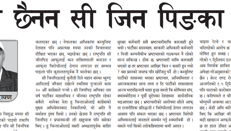 सीपीसीको २० औं कांग्रेस विशुद्ध रुपमा सी जिनपिङकै वरिपरि केन्द्रित रहेको पाइयो तथापि आन्तरिक रुपमा र बाह्य रुपमा पनि सी जिनपिङ्ग सामु अनेकौं चुनौती रहेका छन् । कोभिड–१९ लाई नियन्त्रण गर्न अपनाइएको कोभिड शुन्य नीति, बिआरआई र भ्रष्टाचार विरोधी अभियान उनको निम्ति ठुलो समस्या सावित हुने निश्चित छ । यसका प्रारम्भिक लक्षणहरु देखा पनि पर्न थालेका छन् । सी जिनपिङका आगामी दिनहरु सहज हुने छैनन । उत्तरी छिमेकी चीनमा विगत एक दशकदेखि त्यहाँको राष्ट्रपति पदमा काबिज सी जीनपिङ जीवनभरीकै लागि राष्ट्रपति रहने भए । गत महिना बेइजिङ्गको तियानमेन स्क्वायरमा आयोजित चिनियाँ कम्युनिष्ट पार्टीको २० औं कांग्रेसमा उपस्थित चीनका विभिन्न क्षेत्रका २ हजार तीन सय प्रतिनिधिले २ सय जना केन्द्रिय समिति सदस्य चुने । यिनीहरुले फेरी २५ जना पोलिटब्युरोको सदस्य चुने । यी २५ जनाले अन्त्यमा गएर ७ सदस्यीय सर्वोच्च पोलिटब्युरोको स्ट्यानडिङ्ग कमिटि चुने, जहाँ प्रथम नेता फेरी सी जीनपिङ नै हुने भए । यस पदमा काबिज हुने बित्तिकै सी जीनपिङ देशको सबैभन्दा माथिका तीन महत्वपूर्ण स्थान आफ्नो नियन्त्रणमा राख्ने भए । विगत दश वर्षदेखि उनी नै यस पदलाई ओगटी राखेका छन् । सी जीनपिङ चिनियाँ कम्युनिष्ट पार्टीका मूख्य सचिव, चीनका राष्ट्रपति र चीनको सेन्ट्रल मिलिट्री कमिशनका अध्यक्ष हुने भए । अर्को शब्दमा भन्नुपर्दा पार्टी, सरकार र चीनको केन्द्रिय सैन्य आयोगका प्रमुख पनि उनी नै हुनृ भए । चिनियाँ कम्युनिष्ट पार्टीको सन् २०१७ को १९ औं कांग्रेसले प्रत्येक दश वर्षमा पार्टीको नेतृत्व परिवर्तन गर्ने चलिआएको संवैधानिक प्रावधान हटाइसकेपछि त्यतिबेला नै सी जिनपिङले आफु सधैँका लागि राष्ट्रपति रहने संवैधानिक र कानूनी मार्गलाई आफ्नो निम्ति अनुकूल बनाउने काम गरे । माओत्सेतुङ्ग झै आफ्नो विचारहरुलाई पनि चीन भित्र र चीन बाहिरका कम्युनिष्ट समर्थकहरु माझ ब्यापक रुपमा प्रचार प्रसार गर्ने अभिमान नै चलाएका छन् । नेपालका अधिकांश कम्युनिष्ट नेताहरु पनि अप्रत्यक्ष रुपमा उनको विचारबाट दीक्षित भएका छन्, भइरहेका छन् । राष्ट्रपति सी जीनपिङ आफुलाई झन शक्तिशाली बनाउन र आफ्ना विरोधीलाई ठेगान लगाउन हर सम्भव पाइला पनि कुशलतापूर्वक नै चालेका छन् । सी जिनपिङलाई चुनौती दिने महान संस्था झुण्ड आदिलाई जरैबाट उखेल्ने स्थतिमा पु¥याउने काम २० औं कांग्रेसले ग¥यो । सी जिपपिङ अघिका दश वर्ष पार्टीका महासचिव र चीनका राष्ट्रपति रहेका सबैले मानेका नेता हु चिन्ताओलाई कांग्रेसको मुख्य अधिवेशनबाट निकालियो, यो अति नै मर्माहत्त दृश्य थियो । उनको छेउमा नै राष्ट्रपति सी जिनपिङ र प्रधानमन्त्री ली खहुचाङ्ग पनि बसेका थिए ।