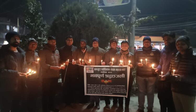 काठमाडौबाट पोखराको लागि उडान भरेको यती एयरलाइन्सको विमान दुर्घटनामा ज्यान गुमाएकाहरुको सम्झनामा दीप प्रज्वलन गरिएको छ। सोमबार साँझ क्यान बाराको आयोजनामा कलैयाको भरतचौकमा क्यान बाराका पदाधिकारी तथा सदस्यहरुले दिप प्रज्वलित गरी मृतकप्रति श्रद्धाञ्जलि दिइयो।