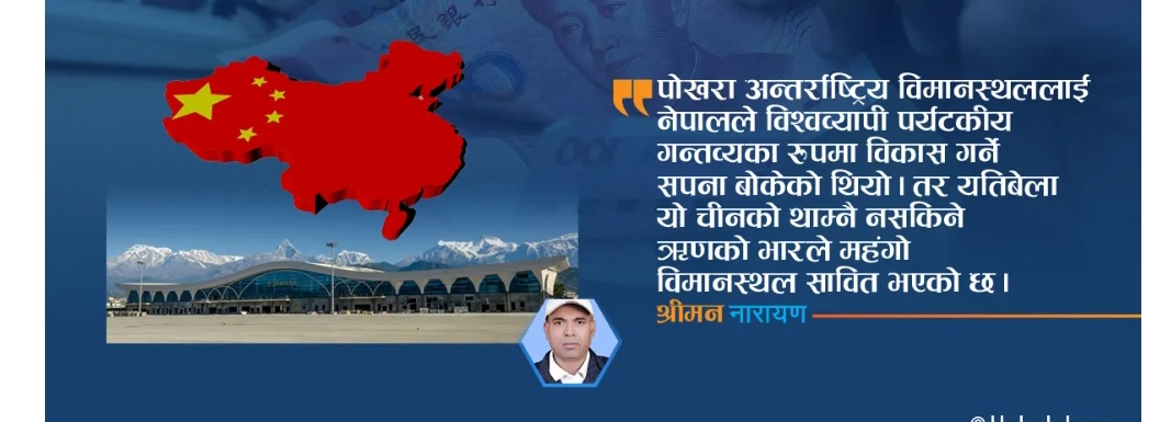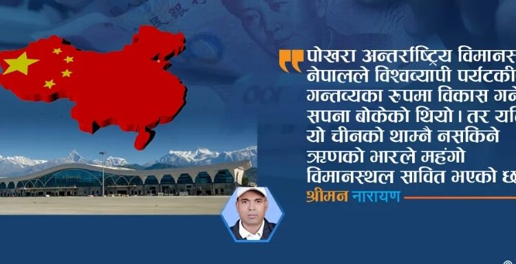 नेपालले सन् १९७० को दशक अन्त्यदेखि नै पोखरामा अन्तर्राष्ट्रिय विमानस्थल निर्माण गर्न खोजेको थियो। जसले गर्दा यस सहरलाई विश्वको पर्यटकीय गन्तव्य बनाउन सकियोस। तर यो परियोजना राजनीतिक उथलपुथल नोकरशाही र पैसाको समस्यामा फसेको थियो। चिनियाँ ऋण हात आएपछि बल्ल यो सञ्चालनमा आएको छ। मानौं, नेपाली राजनीतिज्ञहरु चिनियाँ ऋणकै प्रतिक्षामा बसेका थिए।
