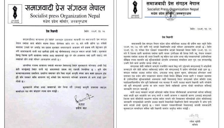 समाजवादी प्रेस संगठन नेपाल मधेश प्रदेश समितिका अध्यक्षले जारी गरेको विज्ञप्तिप्रति प्रदेश समितिको गम्भिर ध्यानाकर्षण भएको छ । समितिका सचिव रमेश सुवेदीले सोमबार एक विज्ञप्ति जारी गरि अध्यक्ष प्रवीण साहले मिति २०७९/११/२८ गते जारी गरेको विज्ञप्तिमा संगठनको विधान र मर्म विपरित कार्य गरेको कारण जिल्ला कार्य समितिले निष्काशन गरि सकेको गैर पत्रकारको संरक्षणका लागि जारी गरेको विज्ञप्तिप्रति गम्भिर ध्यानाकर्षण भएको जनाएका छन् ।